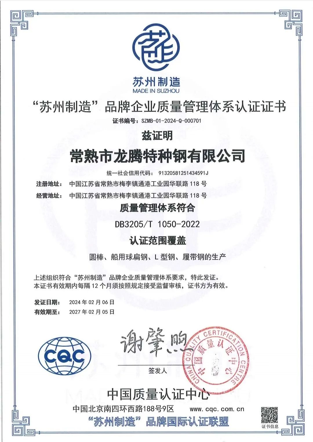 常熟市龍騰特種鋼有限公司首批通過“蘇州制造”品牌企業質量管理體系認證