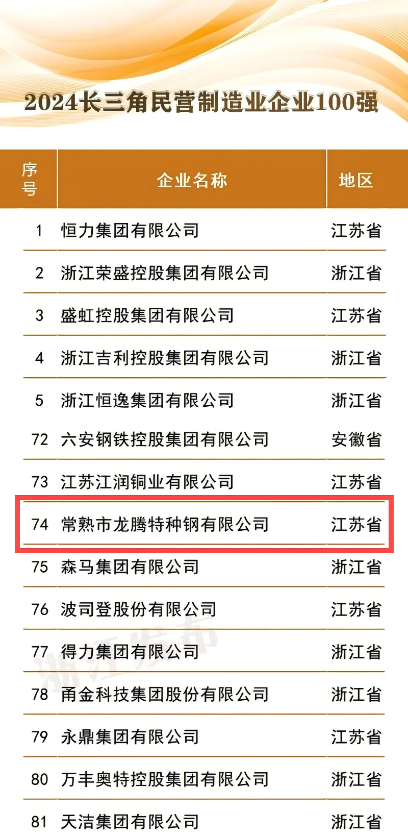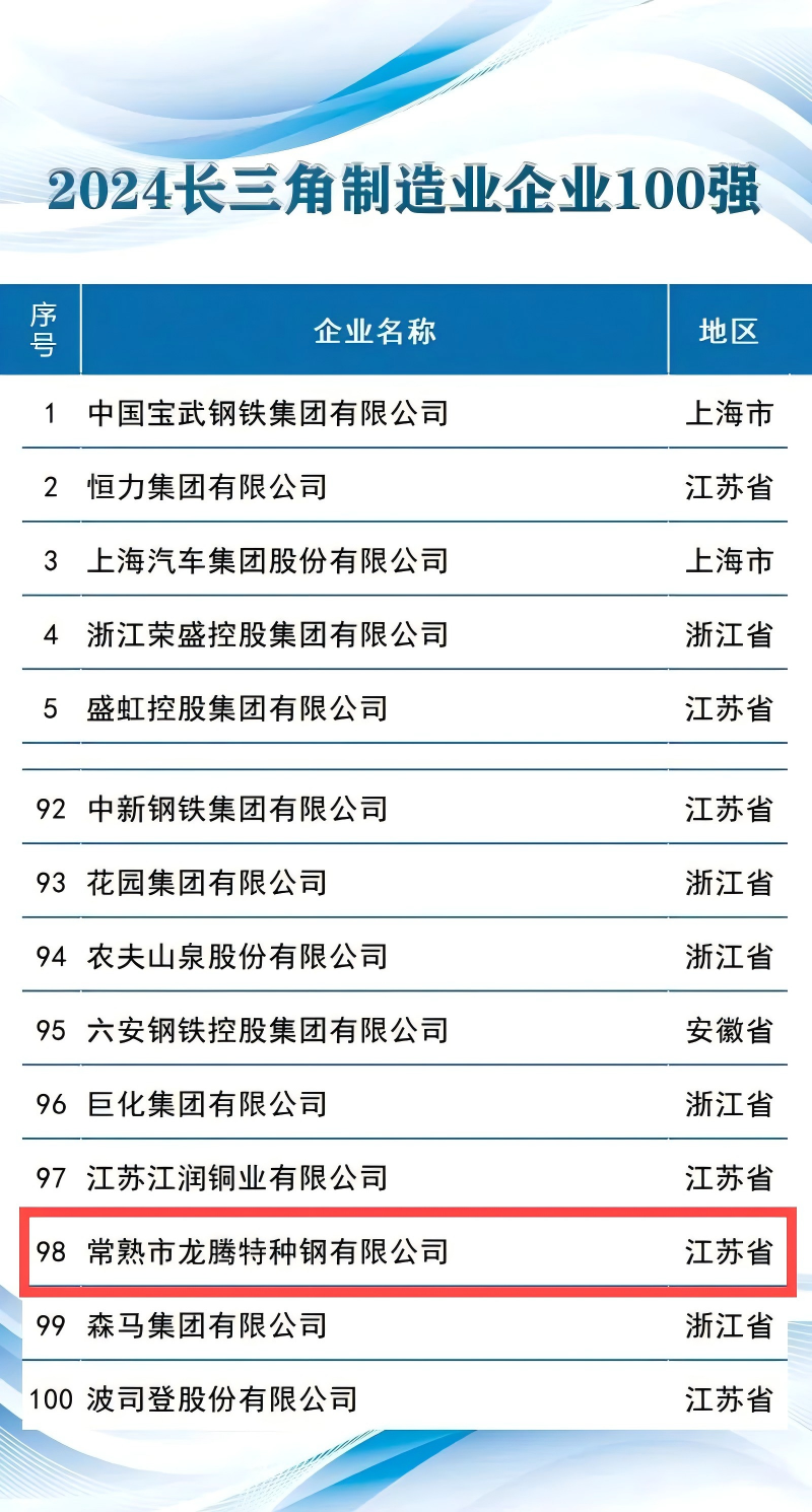 常熟市龍騰特種鋼有限公司位列“2024長三角制造業企業100強”第98位;